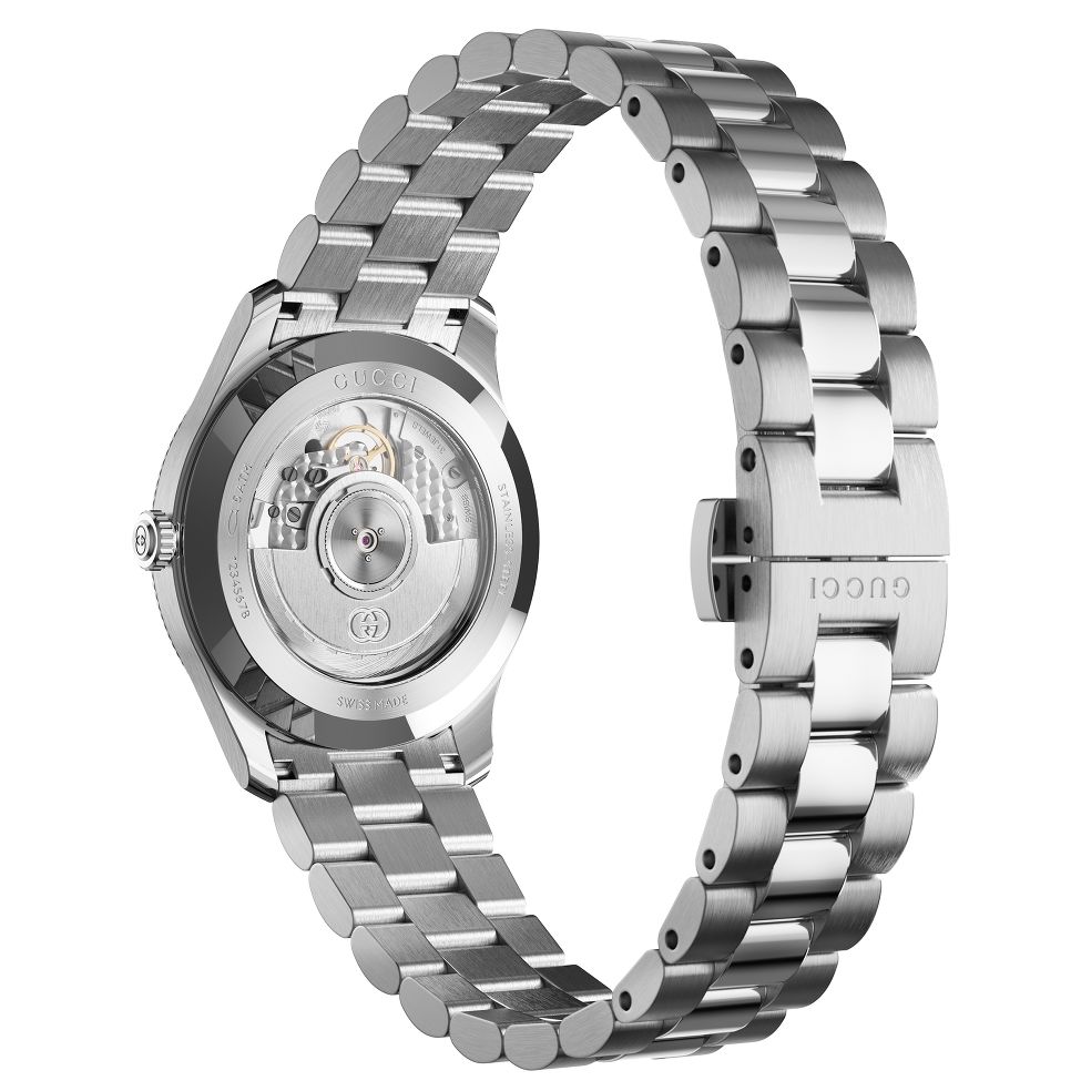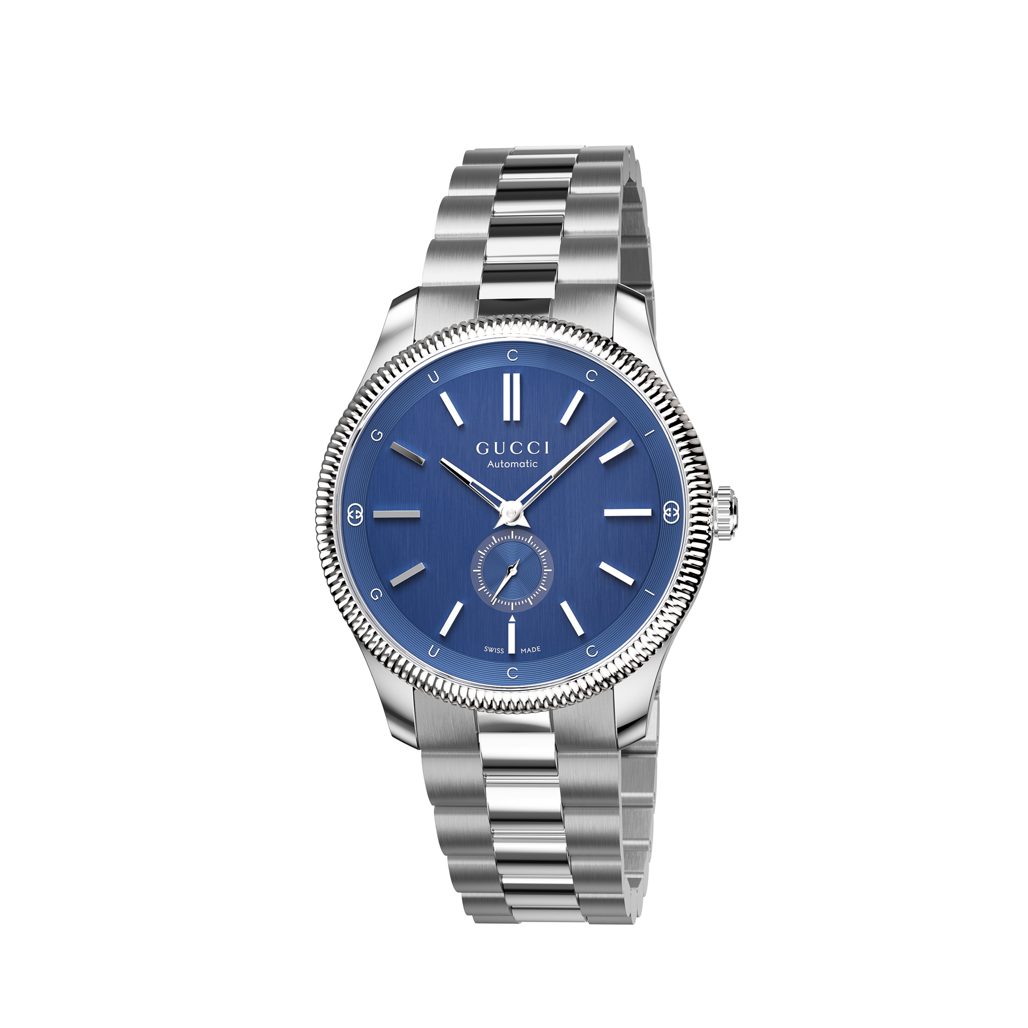 Gucci G-Timeless 手表配备 40 毫米不锈钢表壳,优雅的蓝色表盘上展示了 GG 标志和 Gucci 字样的微妙变化。钢表带和小秒针显示完善了设计。这款自动表的动力储备为 42 小时,防水深度达 50 米。