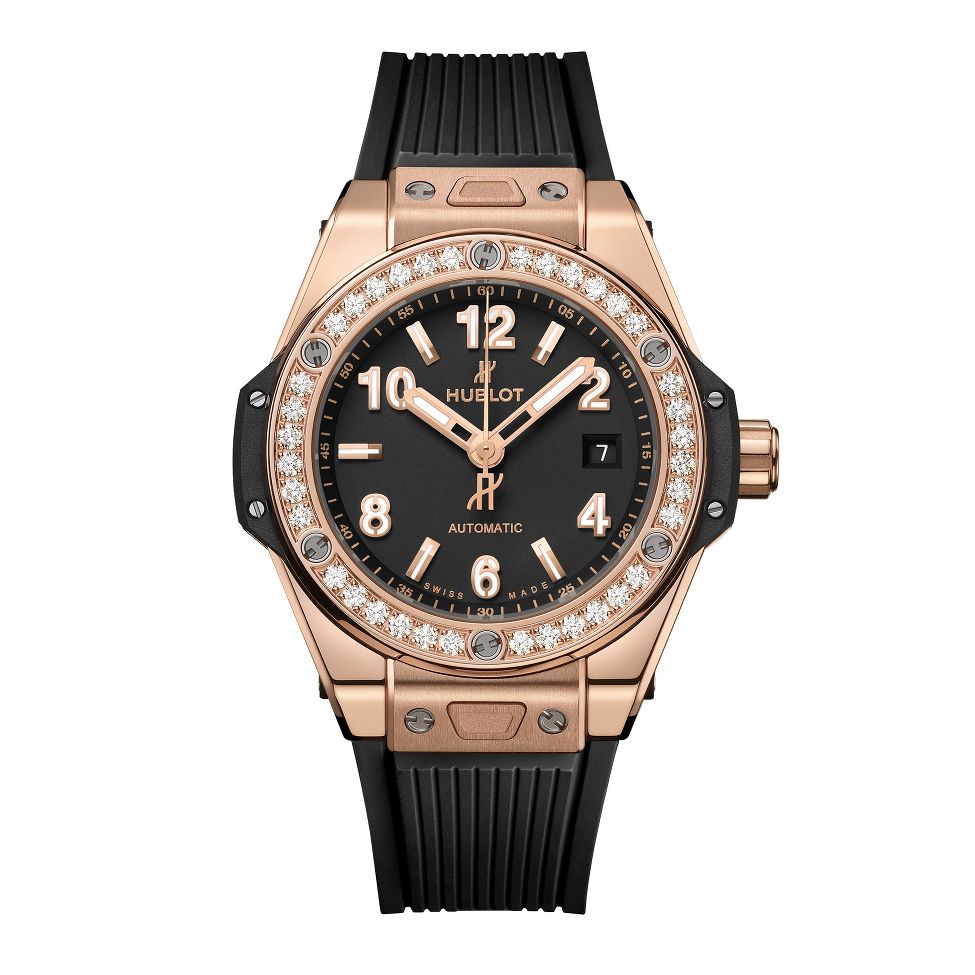 宇舶 Big Bang 系列 33 毫米 One Click 王金钻表,拥有 18 K 王金拉丝表壳,表圈镶嵌 36 颗钻,由六颗 H 形钛金螺丝固定; 哑光黑色表盘,搭配白色荧光指针和时标,日历视窗置于三点钟处; 搭载 HUB 1120 型自动上弦机芯;橡胶表带搭配折叠式表扣更显时尚风范。