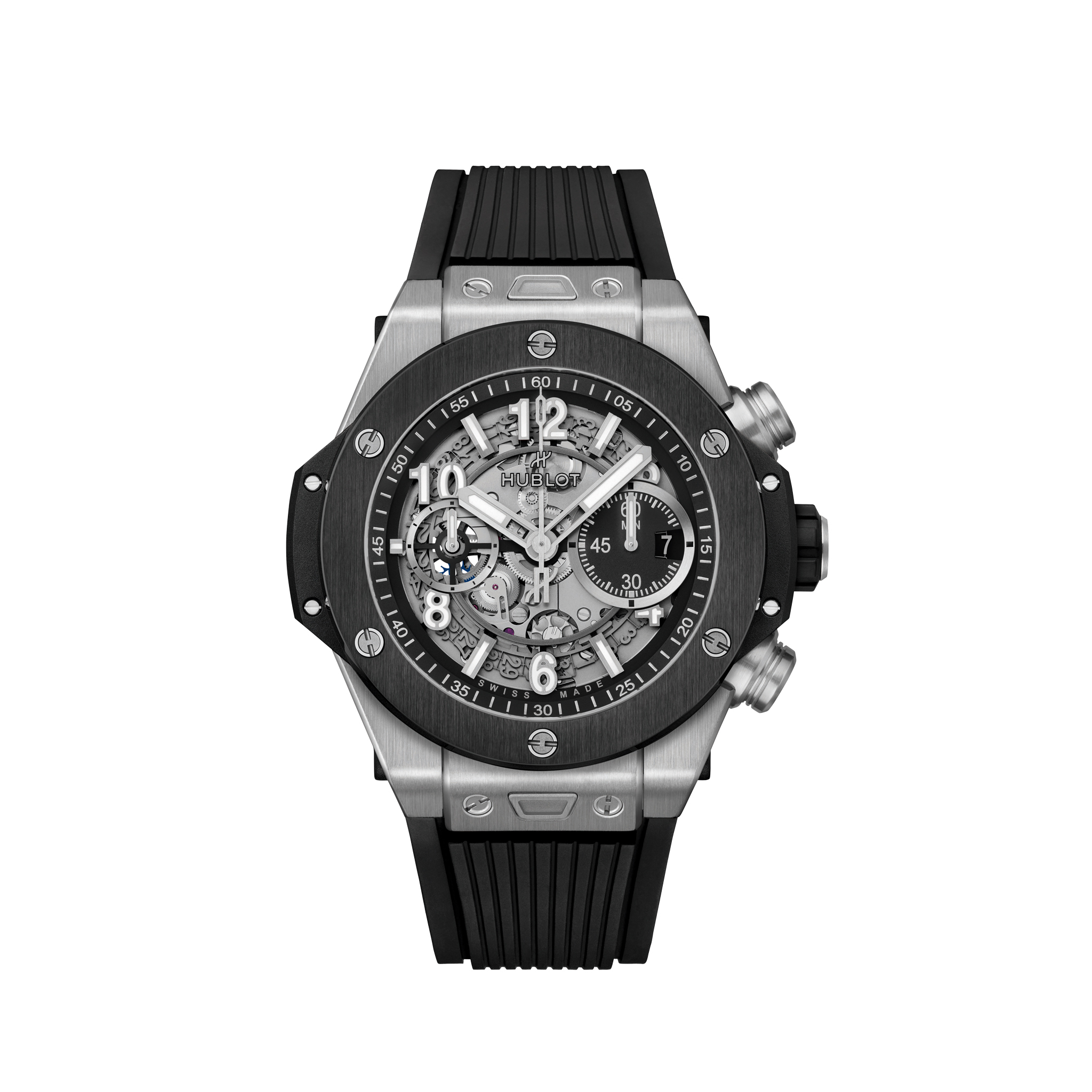 宇舶 Unico Titanium 44 毫米腕表,丰富 Big Bang 系列设计。 缎面及抛光钛金表壳搭配采用 6 颗 H 形品牌标识钛金螺钉固定的表圈,金属表圈下层为黑色树脂表圈; 在镂空表盘上,日期窗口设置于小秒针计时盘中。 搭载 HUB 1280 飞返计时自动上链机芯。 结构良好的黑色橡胶表带为这款独特腕表增添点睛之笔。