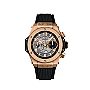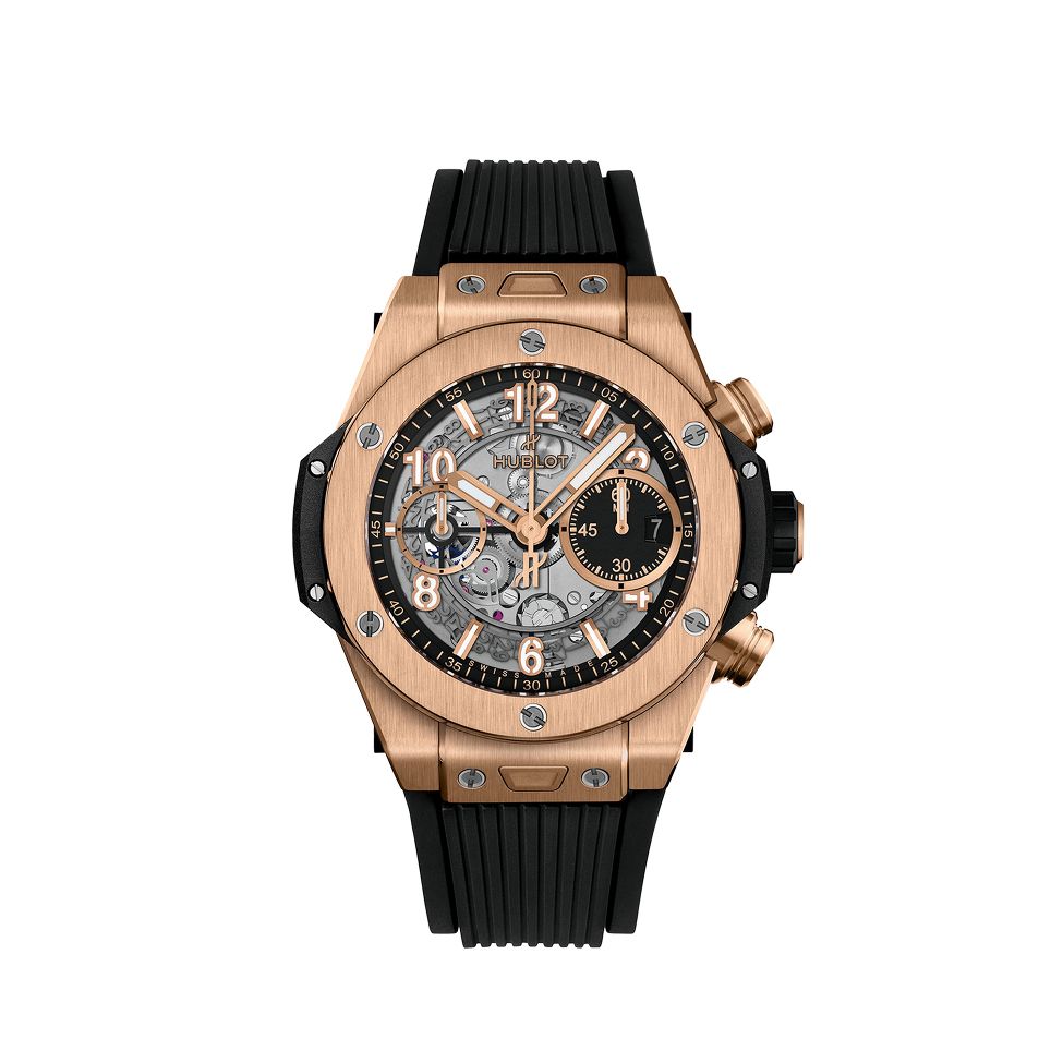 宇铂推出 Unico King Gold 42 毫米腕表,拓展了 Big Bang 系列。 缎面王金表壳呈现出表圈,该表圈由覆盖下部黑色树脂表圈的六颗标志性 H 形钛螺丝固定。 在哑光黑色镂空表盘上,日期视窗嵌入小秒计时盘中。 HUB 1280自动上链计时飞返机芯确保72小时的动力储存。 黑色结构化橡胶表带为这款独特时计增添了点睛之笔。
