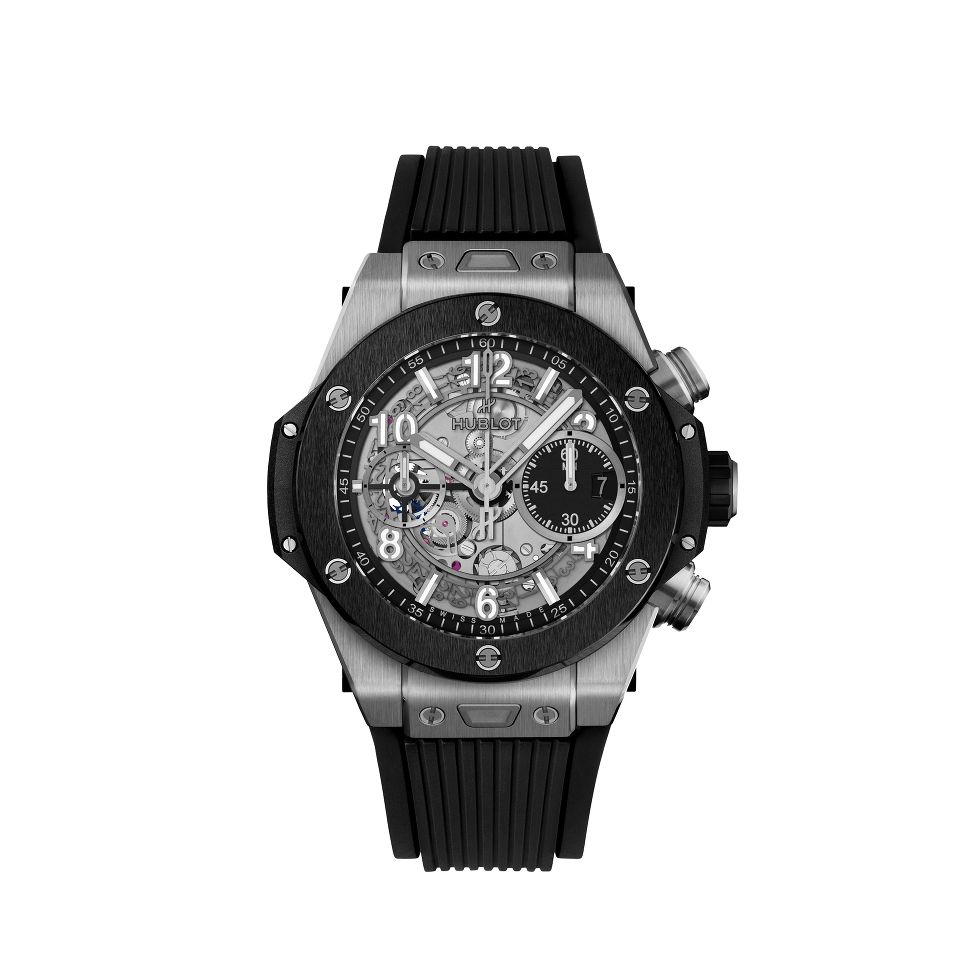 这款宇舶计时码表配备42毫米缎面抛光钛金表壳,黑色陶瓷表圈并固定六颗H型钛螺钉。哑光黑色表盘,防反射蓝宝石水晶保护。搭载HUB1280 UNICO自动计时机芯,带飞返功能和柱轮,动力储备72小时,防水100米。