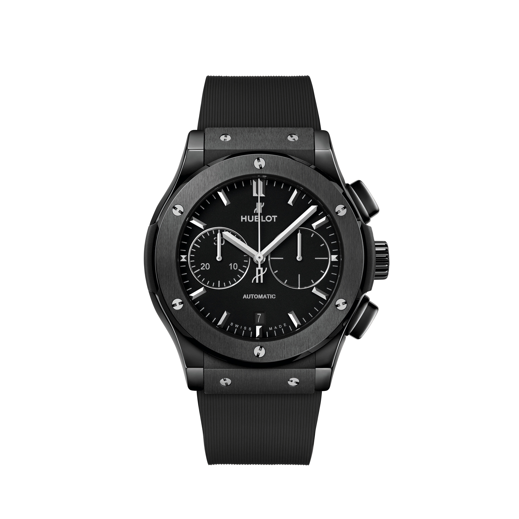 作为宇铂经典融合系列的一部分,Chronograph Black Magic 配备 45 毫米抛光缎面黑色陶瓷表壳。 黑色陶瓷表圈由六颗标志性 H 形钛螺丝固定到位。 哑光黑色表盘上配有夜光时标和指针,两个计时盘分别位于三点钟和九点钟位置,日期窗口位于六点钟位置。 透过透明表背可看到自动上链HUB1143机芯。 黑色衬里橡胶表带搭配镀黑精钢折叠表扣,为这款腕表增添了点睛之笔。