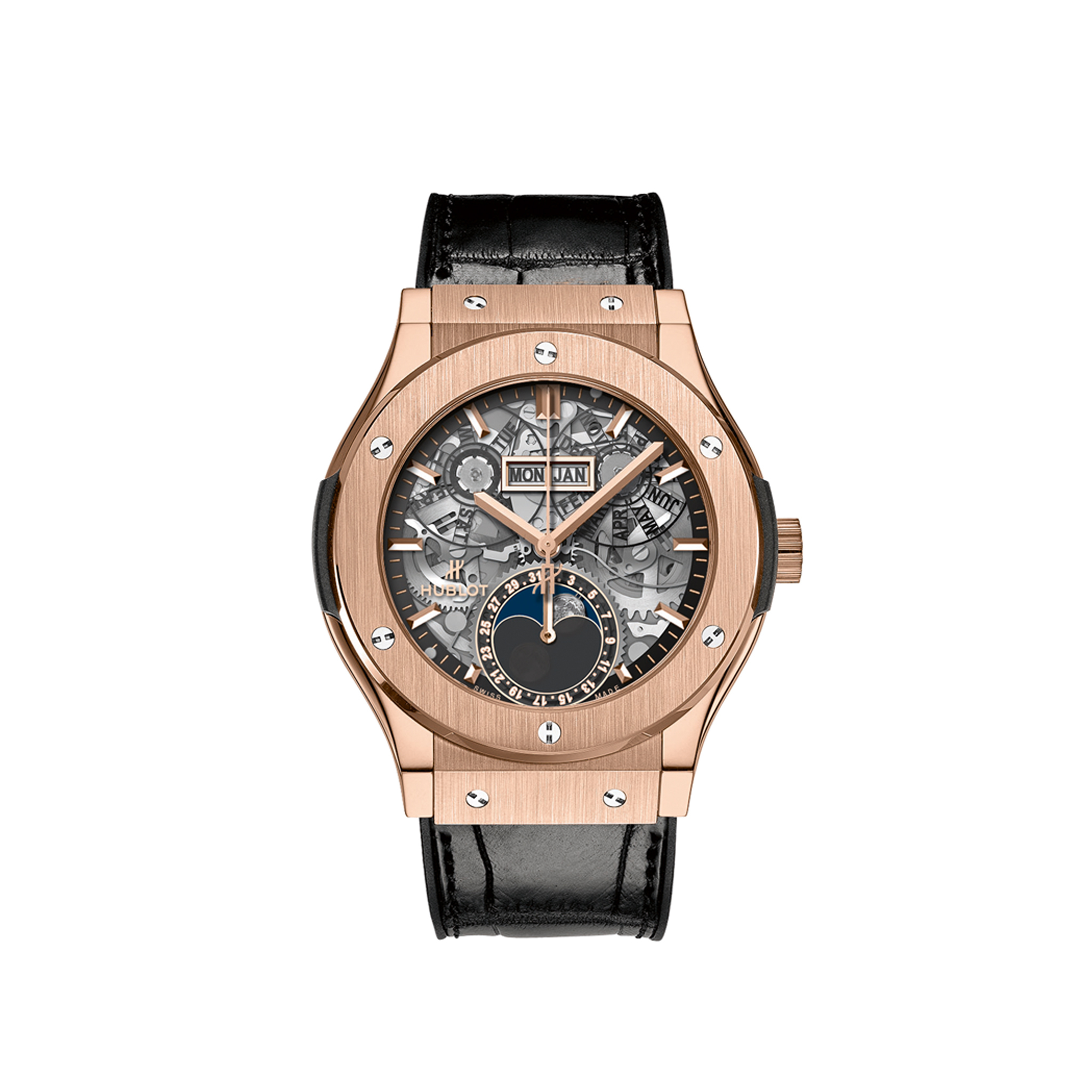 宇舶推出 Aerofusion 月相王金腕表,是经典融合系列的引人注目的延伸。 42 毫米王金表壳的表圈由六颗标志性的 H 形钛螺丝固定。 透明蓝宝石水晶表盘配有镀金贴花和指针,具有星期和月份日历以及月相和日期指示。 HUB 1131自动上链机芯确保42小时动力储存。 黑色橡胶和鳄鱼皮表带增添了点睛之笔。
