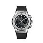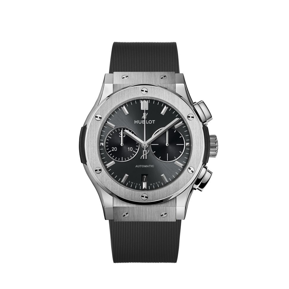 这款宇舶计时码表采用45毫米缎面抛光钛金表壳,搭配缎面抛光钛金表圈并由六颗H型钛合金螺钉固定。灰色太阳纹表盘配防反射蓝宝石水晶。搭载HUB1143自动计时机芯,动力储备42小时,防水50米。