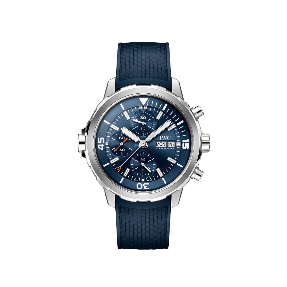 IWC Schaffhauses 推出海洋腕表潜水表,这款腕表以其坚固的结构、耐高压性、易读性和创新的技术功能而闻名。 44 毫米耐腐蚀不锈钢表壳配备内外旋转表圈。蓝色表盘配备荧光指数、日期和星期显示以及计时功能。 79320 型机芯提供 44 小时的动力储存。带有 IWC 万国表快速更换系统的蓝色橡胶表带更为点睛之笔。