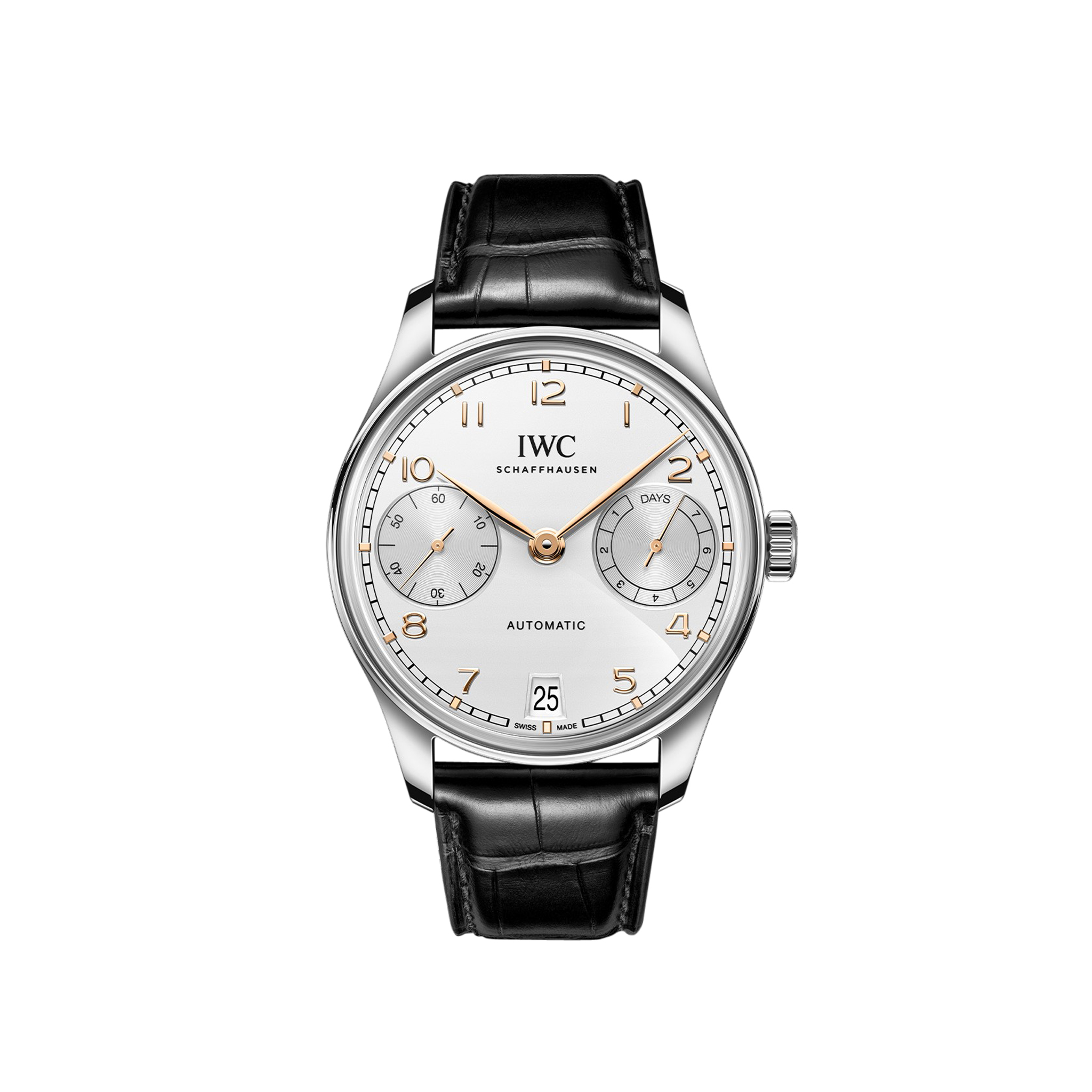 IWC万国表葡萄牙系列 42 自动腕表以其优雅的设计和先进的技术令人印象深刻。直径 42.4 毫米的精钢表壳搭配银色表盘。腕表配备自动上链装置,确保精准计时。黑色鳄鱼皮表带增添了经典气息,蓝宝石水晶透视底盖让内部一览无余。腕表防水深度达 50 米,适合日常佩戴和特殊场合使用。