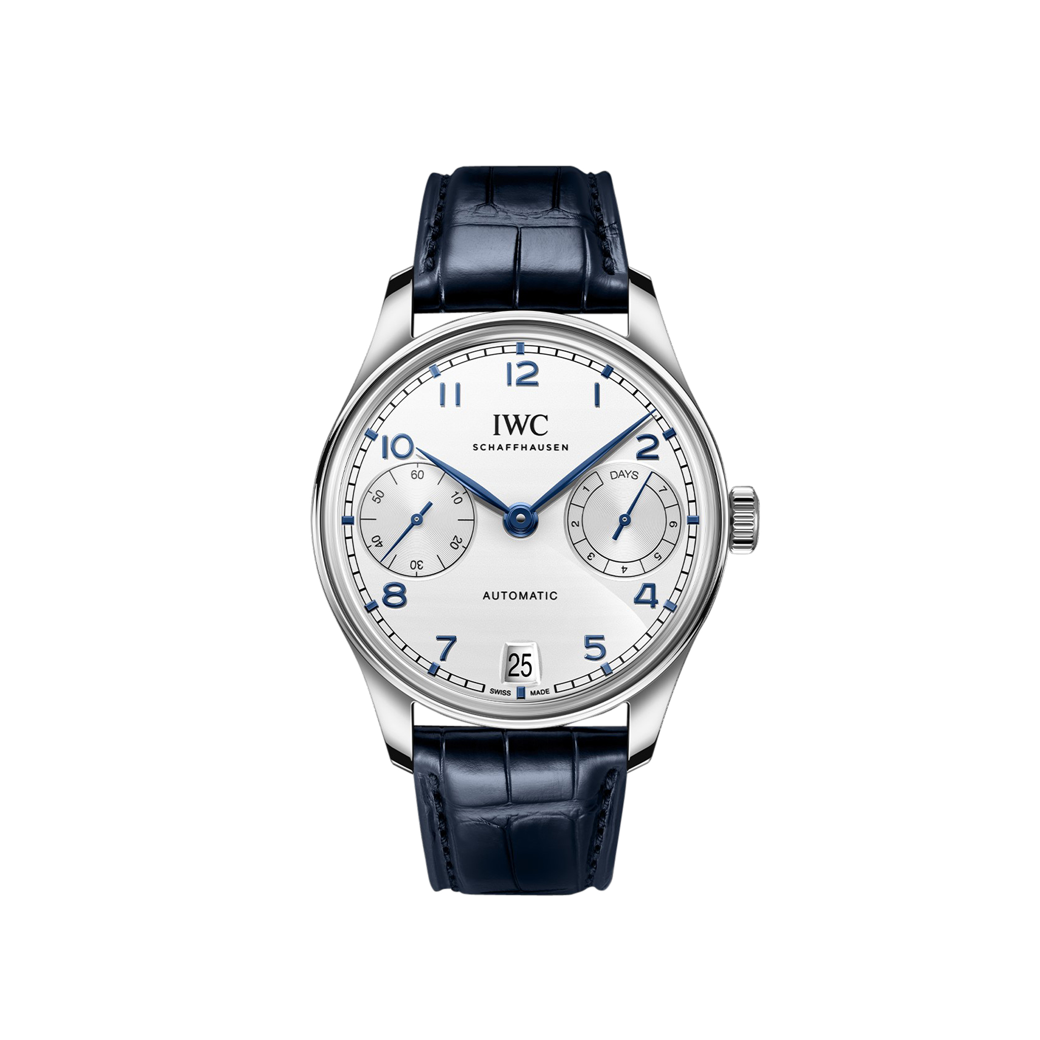 IWC 万国表葡萄牙系列 42 型自动腕表集优雅与实用于一身。坚固的精钢表壳直径达 42.4 毫米,银色表盘散发出古典美感。蓝色鳄鱼皮表带与精致的外观相得益彰,而蓝宝石水晶透视底盖则让精准的自动上链机芯一览无余。这款手表防水深度达 50 米,将奢华与日常实用性完美结合。
