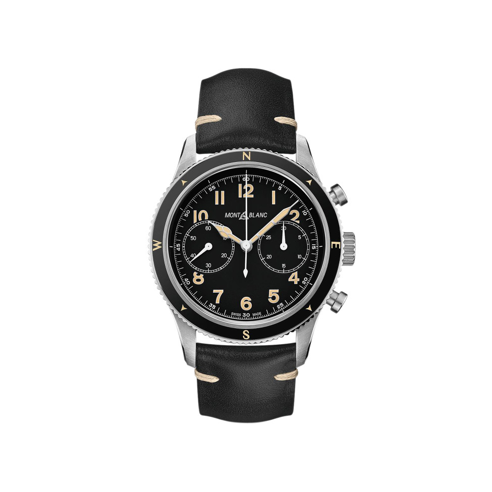 万宝龙 1858 自动计时码表巧妙地将复古美学与当今的精密计时功能融为一体。 42 毫米不锈钢表壳呈现黑色表盘,配有两个计时盘、米色夜光阿拉伯数字和夜光指针。 此版本的特点是采用黑色光面陶瓷装饰的固定不锈钢表圈。 这款时计搭载自动机芯 MB 25.13。 黑色意大利小牛皮表带搭配针扣更为点睛之笔。