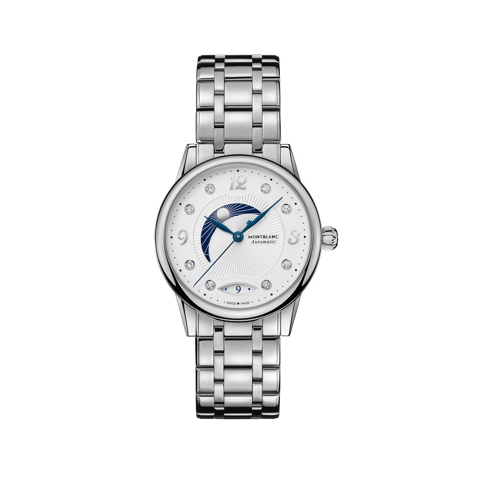 万宝龙宝曦系列自动腕表柔美而浪漫,配备 28 毫米不锈钢表壳和蓝宝石水晶底盖。 这款时计搭载 MB 24.14 机芯,动力储存为 38 小时。 银色扭索饰纹表盘配有标志性的蓝色指针、钻石时标和十二点钟、三点钟、六点钟和九点钟的阿拉伯数字,椭圆形日期窗口位于六点钟位置。 昼/夜指示器在白天显示淡蓝色的天空和金色的太阳,在夜间显示银色的月亮映衬着深蓝色的天空。 带折叠扣的精钢链节手链增添了点睛之笔。