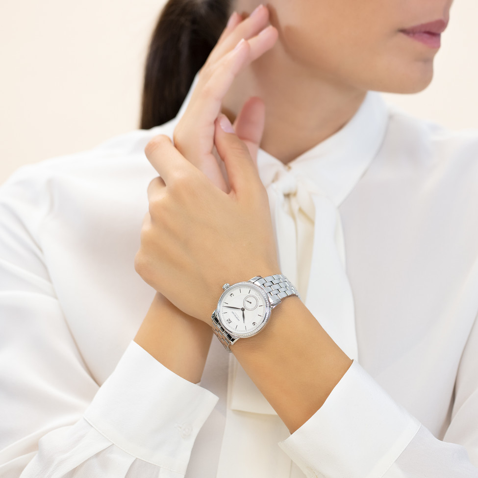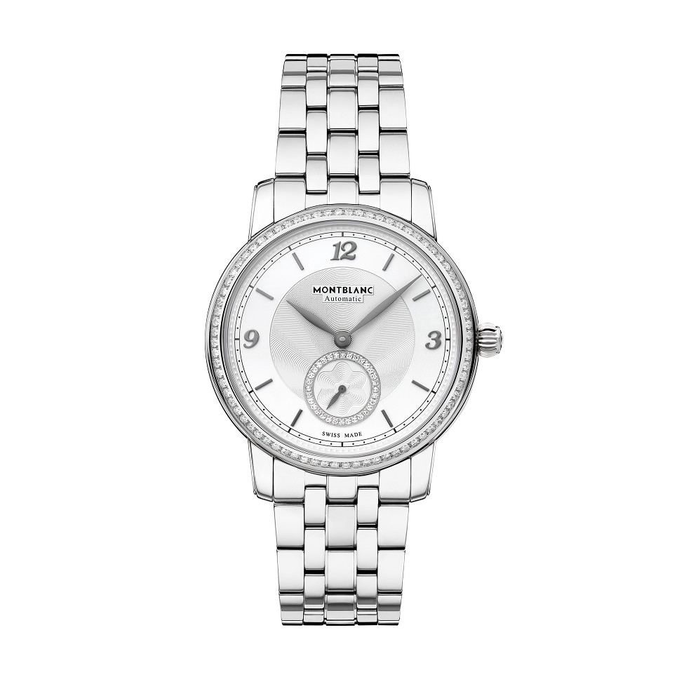 万宝龙Star Legacy Small Second腕表,巧妙地彰显万宝龙的标志性徽标。 36毫米不锈钢表壳搭配镶钻表圈相得益彰。 银色表盘饰有炭黑色时标,小秒针盘周围环镶钻石,玑镂纹饰呼应徽标的设计。 这款腕表搭载MB 24.16机芯,可提供38小时的动力储备。 不锈钢链式表链搭配折叠式表扣,为这款腕表增添点睛之笔。