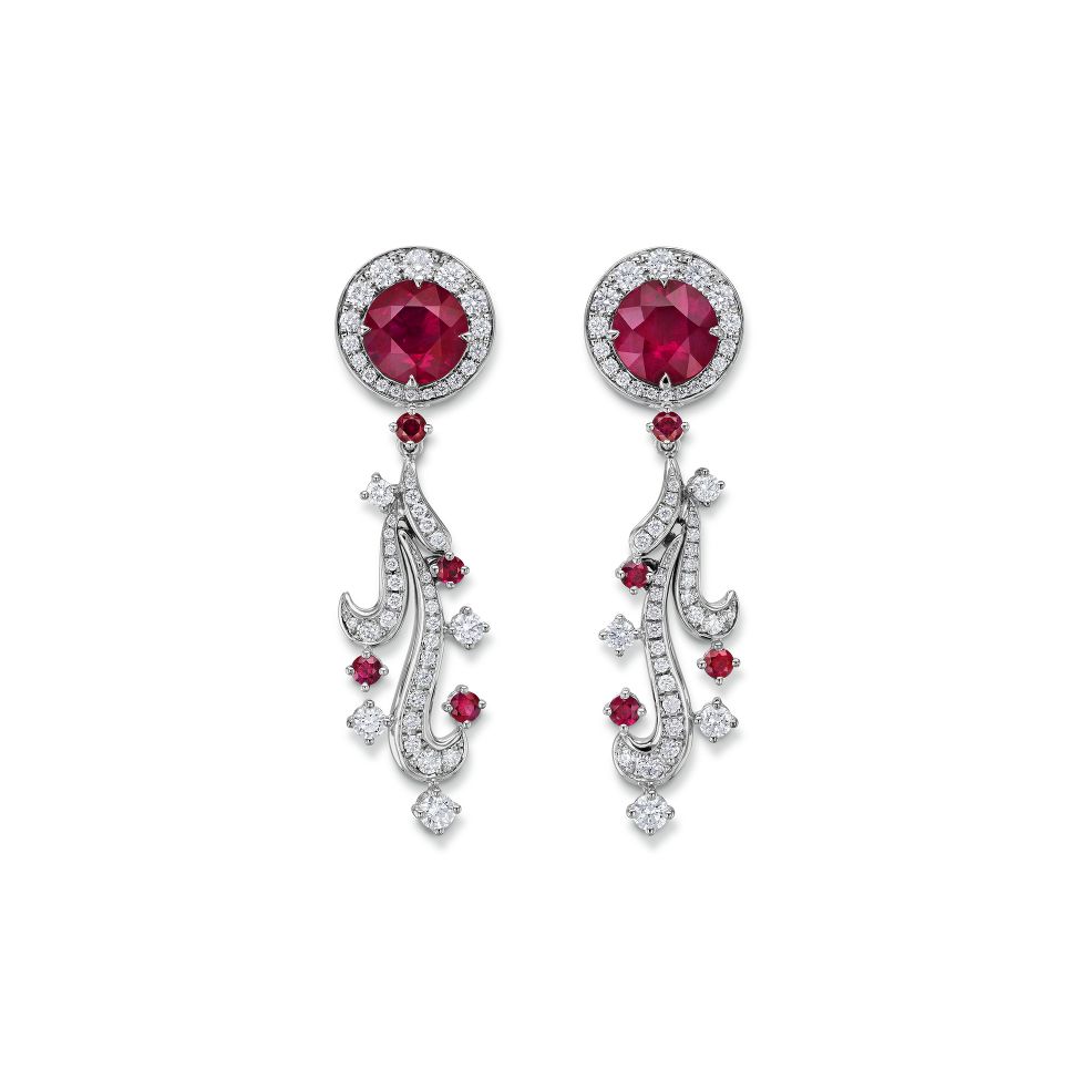 白金耳坠,嵌有2颗产自缅甸的圆形红宝石(重量分别为1.47克拉和1.52克拉)、8颗总重0.28克拉圆形红宝石,以及96颗总重0.89克拉明亮琢型钻石。