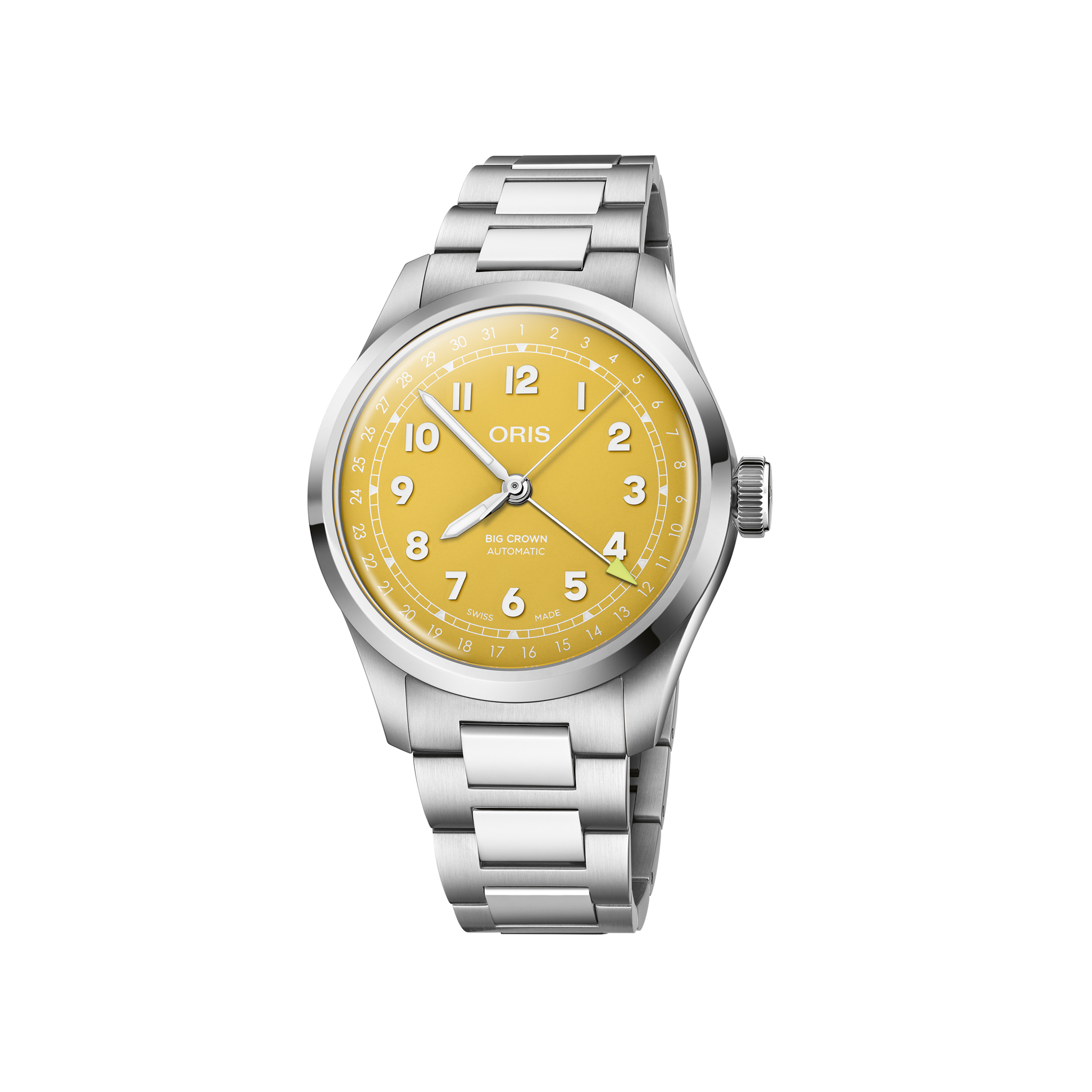 这款 Big Crown Pointer Date 搭载阳光黄表盘,融合航空传统与现代美感。40 毫米不锈钢表壳搭配 H 型链带,彰显经典气质。瑞士自动上链机芯驱动其标志性指针式日期功能。
