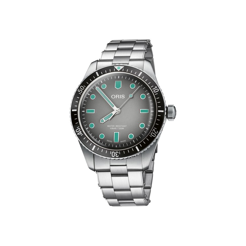 Oris Divers Sixty-Five腕表采用40毫米精钢表壳,复古设计融合现代美感。灰色渐变表盘配以青绿色Super-LumiNova®夜光。搭载Oris 733自动机芯,动力储存38小时,配备蓝宝石水晶镜面,防水深度100米,提供皮革或精钢表链选择。