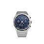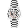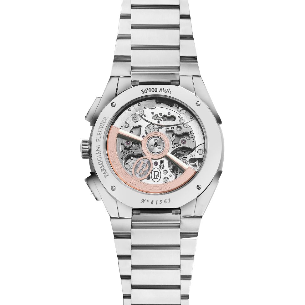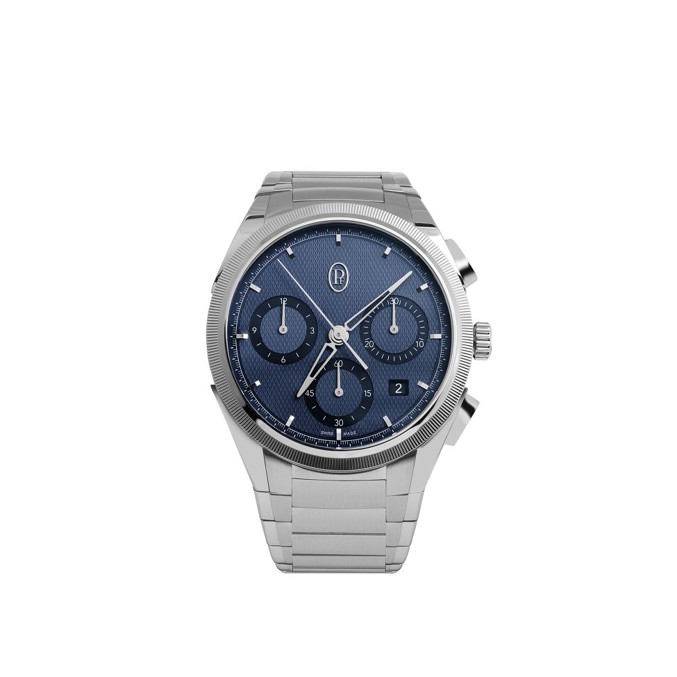 "帕玛强尼 Tonda PF 新款计时码表 彰显独具特色的复杂功能。 42 毫米 不锈钢表壳搭配滚花装饰表圈,蓝色"格状大麦粒"玑镂饰纹表盘, 三角形指针和镶贴时标。 三个 计时表盘和日期视窗相得益彰。 透明表背 展现搭载的自动上弦机芯 PF 070-COSC。 不锈钢表链 更显精密质感。"