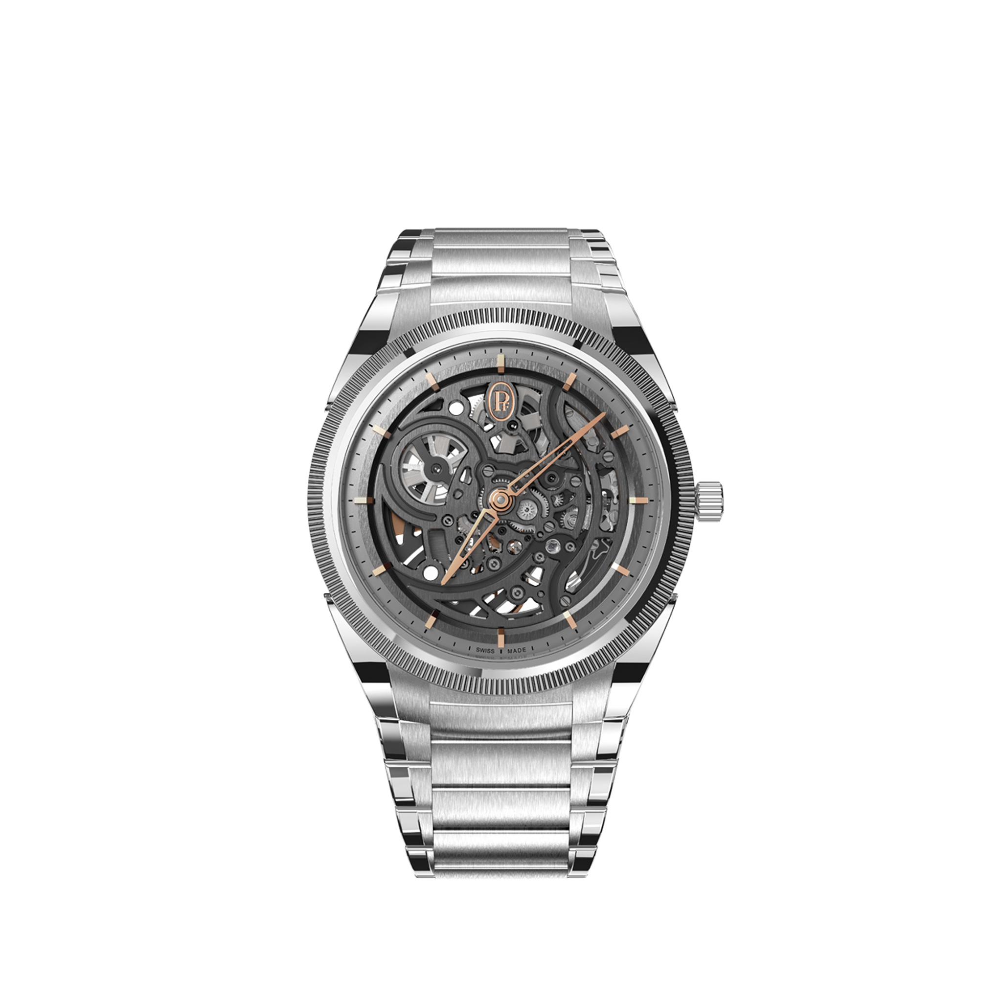 凭借 Tonda PF Skeleton Steel Platinum,帕玛强尼呈现出一款美学卓越的时计。 抛光和缎面打磨的 40 毫米不锈钢表壳搭配滚花表圈,镂空表盘搭配玫瑰金时标和指针。 摆陀以 22 ct 玫瑰金精心打造,透过透明蓝宝石水晶表背清晰可见。 这款腕表搭载 PF777 机芯,可提供 60 小时的动力储存。 带折叠扣的抛光缎面精钢表链增添了点睛之笔。