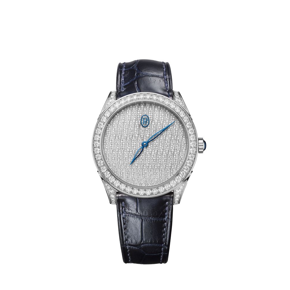 Tonda 自动白金腕表是一款独特的腕表,其设计就像画家想象中的草图一样。 帕玛强尼就像画布上的艺术家一样,在极简表盘上勾勒出 979 颗不同尺寸的钻石,将珍贵的 Grain d'orge 标志性图案栩栩如生。 36 毫米 18 克拉白金表壳上镶嵌有 70 颗钻石,表冠上饰有凸圆面切割蓝宝石。 透明表背展现出配备22克拉玫瑰金摆陀的PF310自动机芯。 蓝色爱马仕鳄鱼皮表带令腕表更加完美。