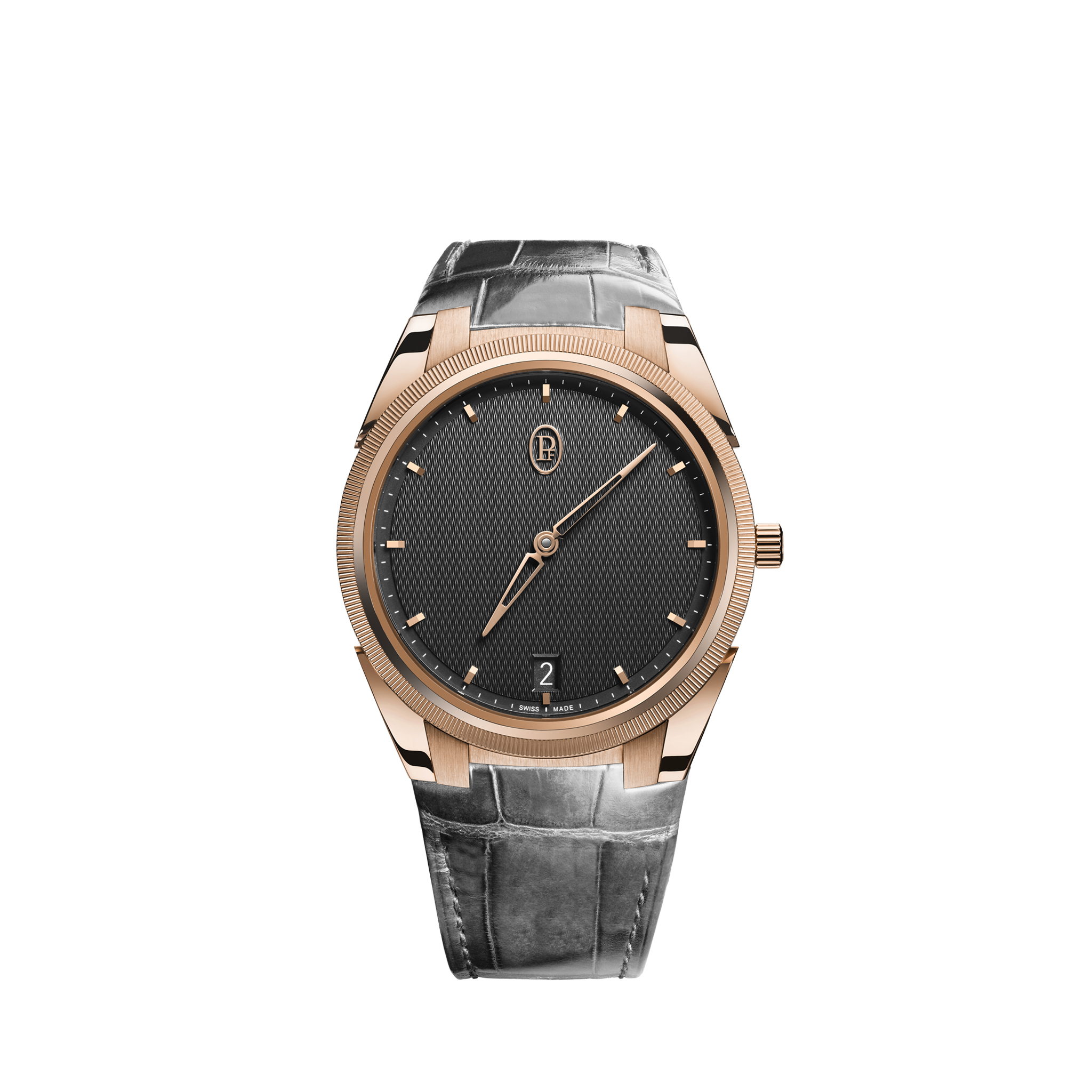 帕玛强尼推出的 Tonda PF Micro Rotor 微转子腕表,以简约的设计向品牌的卓越复杂功能致敬。玫瑰金表壳搭配手工凹槽表圈,灰色表盘上饰有 Grain d'Orge 扭索纹、三角形镂空指针和手工刻度,与日期显示相得益彰。从透明表背可以看到配备微型自动盘的 PF703 自动机芯。灰色鳄鱼皮表带为腕表锦上添花。