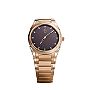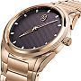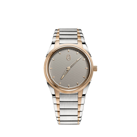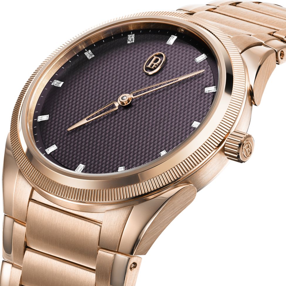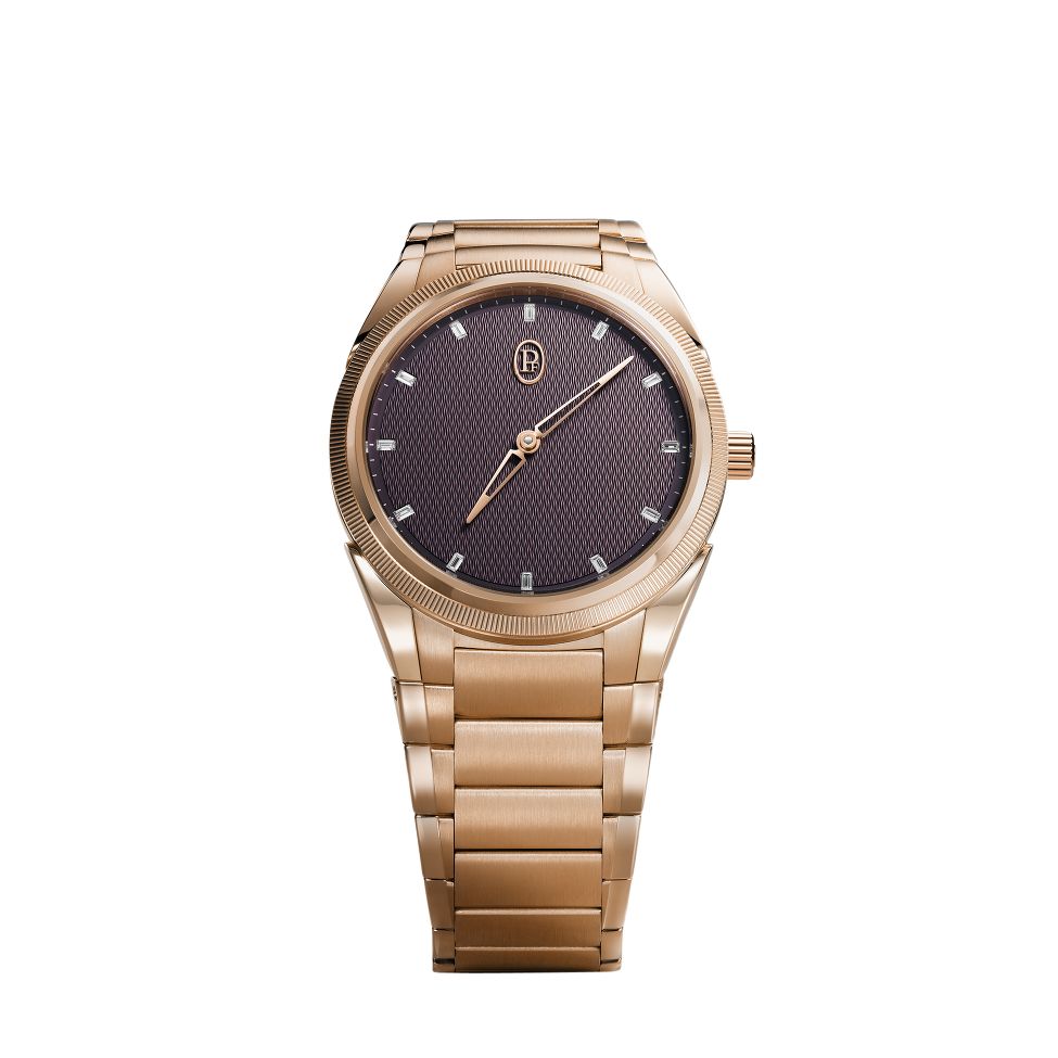 凭借 Tonda PF Automatic,帕玛强尼推出一款美学卓越的腕表。 带滚花表圈的玫瑰金表壳与深红宝石麦穗状扭索纹表盘相得益彰,表盘上镶有镶嵌 12 颗长方形钻石的镀铑贴花和三角镂空指针。 腕表搭载 PF770 自动上链机芯,提供 60 小时动力储存,透过透明表背一览无遗。 带折叠扣的抛光和缎面玫瑰金表链增添了点睛之笔。