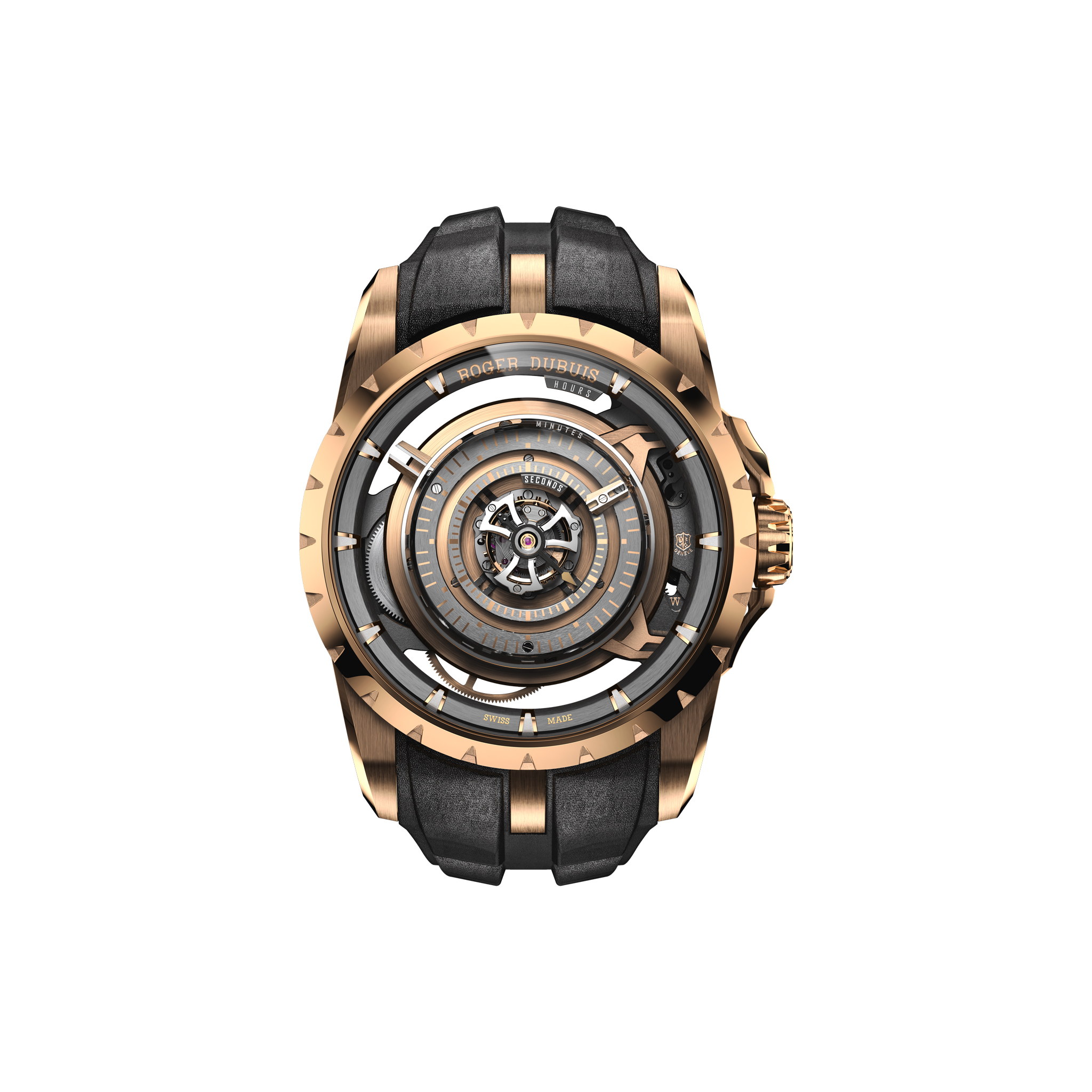 Orbis in Machina 腕表融合现代工程与传统制表艺术。正面展现大胆陀飞轮设计,背面透视古典工艺。45毫米18K玫瑰金表壳搭配黑色小牛皮表带,配备快速更换系统与同色玫瑰金折叠式表扣。防水深度达5巴(50米),尽显和谐对比之美。