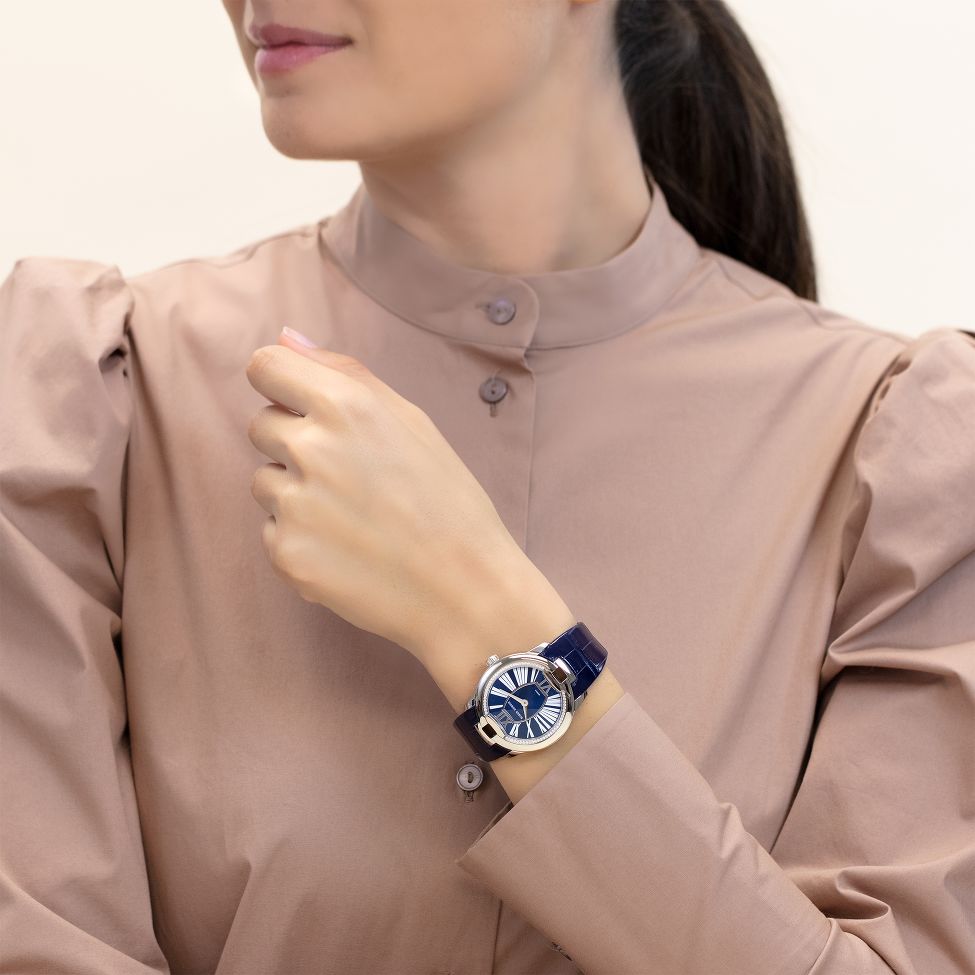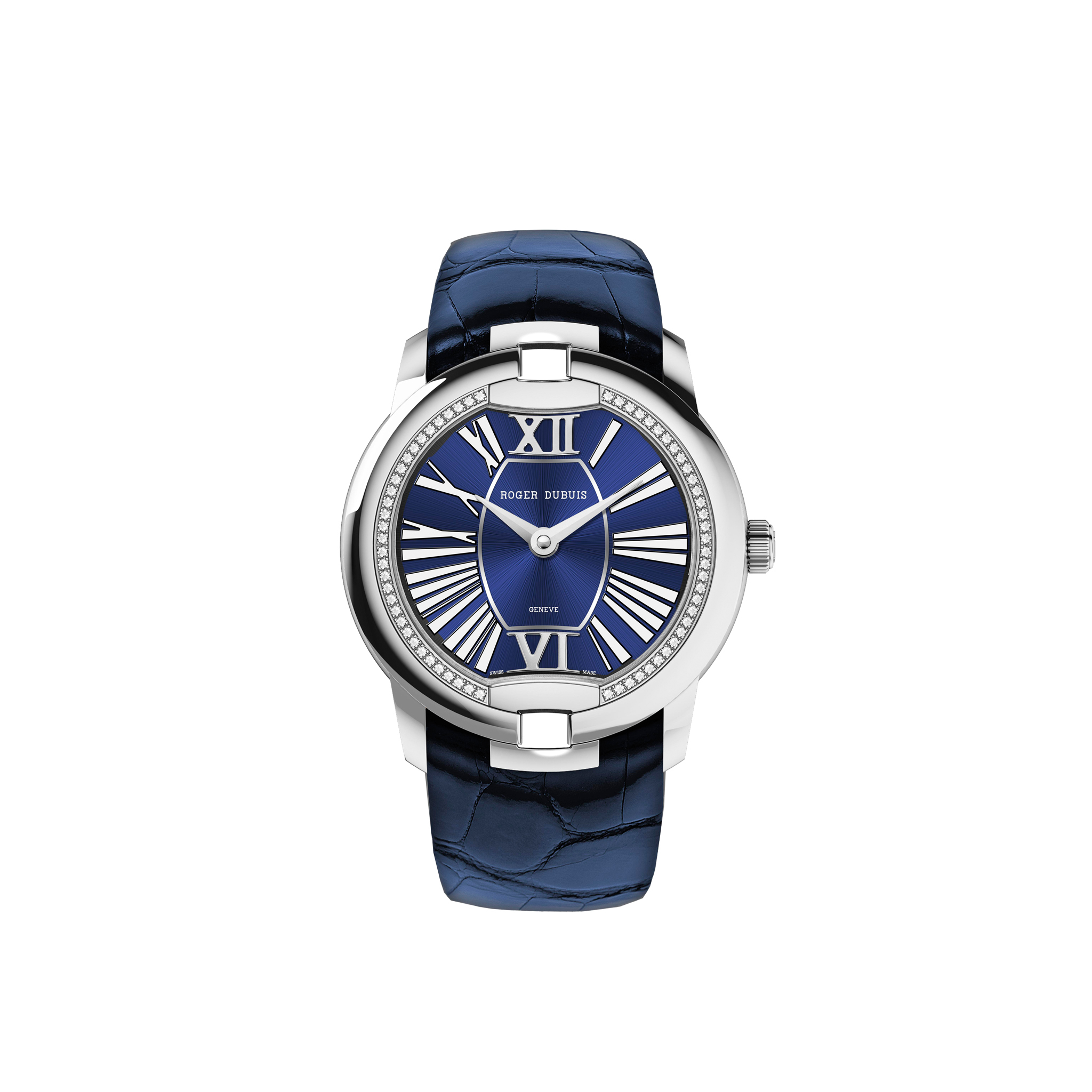 罗杰杜彼的现代 Velvet White Gold – Blue 融合了高级珠宝与最精湛的制表技艺。 白金表壳设有镶钻表圈,环绕着带有罗马数字的蓝色漆面表盘。 透明的表背显示自动机芯 RD830。 日内瓦印记保证了制表工艺的卓越品质,蓝色鳄鱼皮表带搭配白金折叠表扣更添点睛之笔。