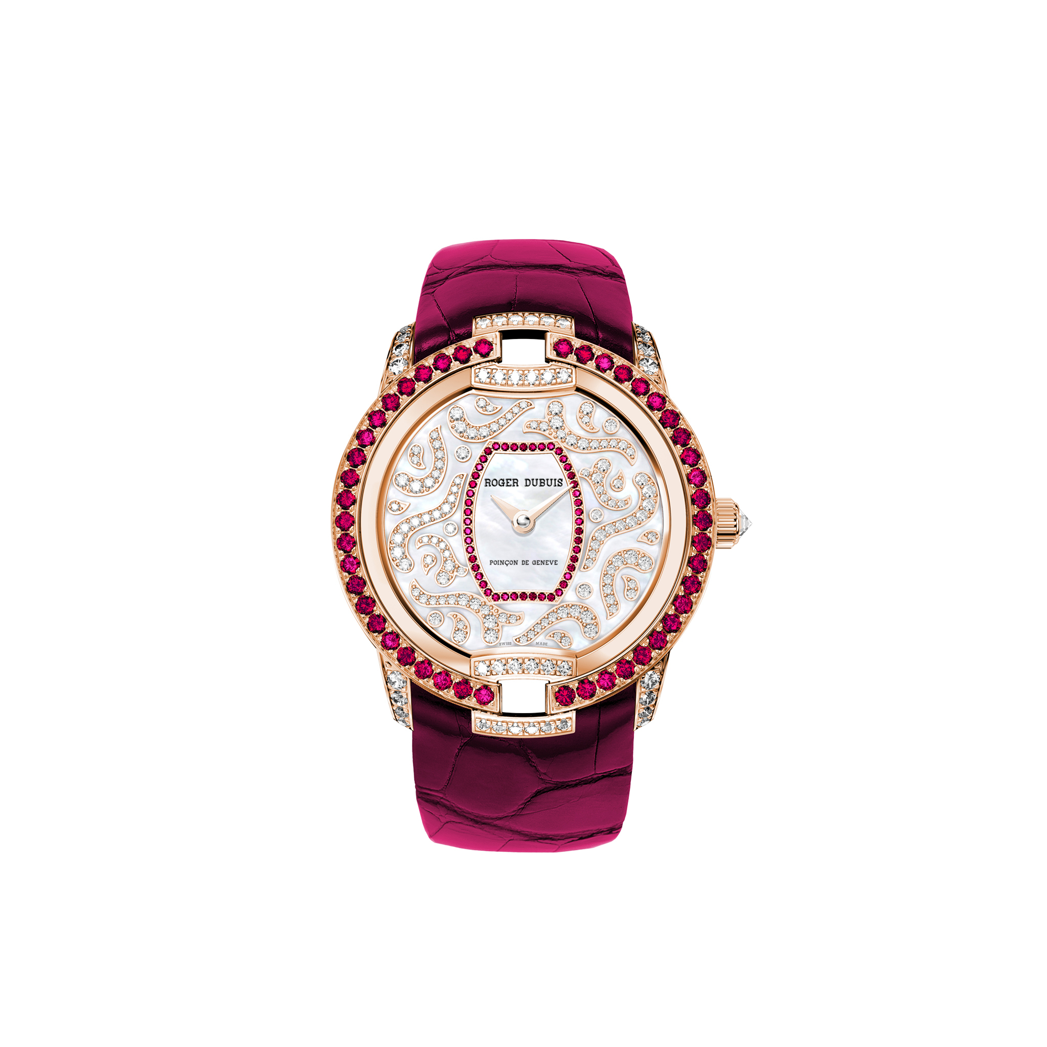 罗杰杜彼的 Velvet 将高级珠宝与最精湛的制表工艺融为一体。 玫瑰金表壳配有镶嵌明亮式切割红宝石的表圈和镶嵌钻石和红宝石等饰物的白色珍珠母贝表盘。 此外,表耳和装饰饰有明亮式切割钻石。 透明底盖展示了自动机芯 RD821,动力储存为 48 小时。 玫红色鳄鱼皮表带搭配镶钻玫瑰金表扣,点睛之笔。