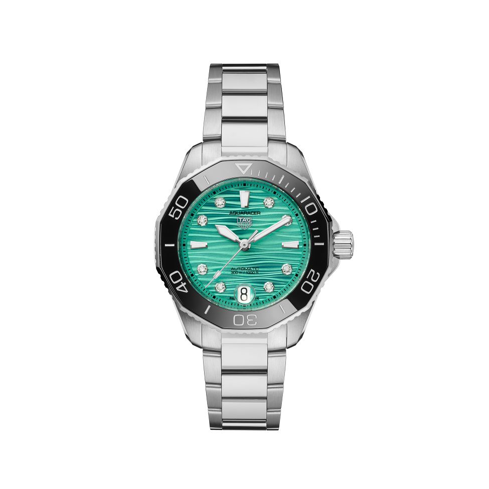 AG Heuer Aquaracer 将潜水美学与精准机械结合。精钢表壳衔接同材质表链,佩戴稳固舒适;内部搭载 Calibre 5 自动机芯,走时稳定可靠。钻石时标总重约 0.08 克拉,低调增辉并提升读取性。