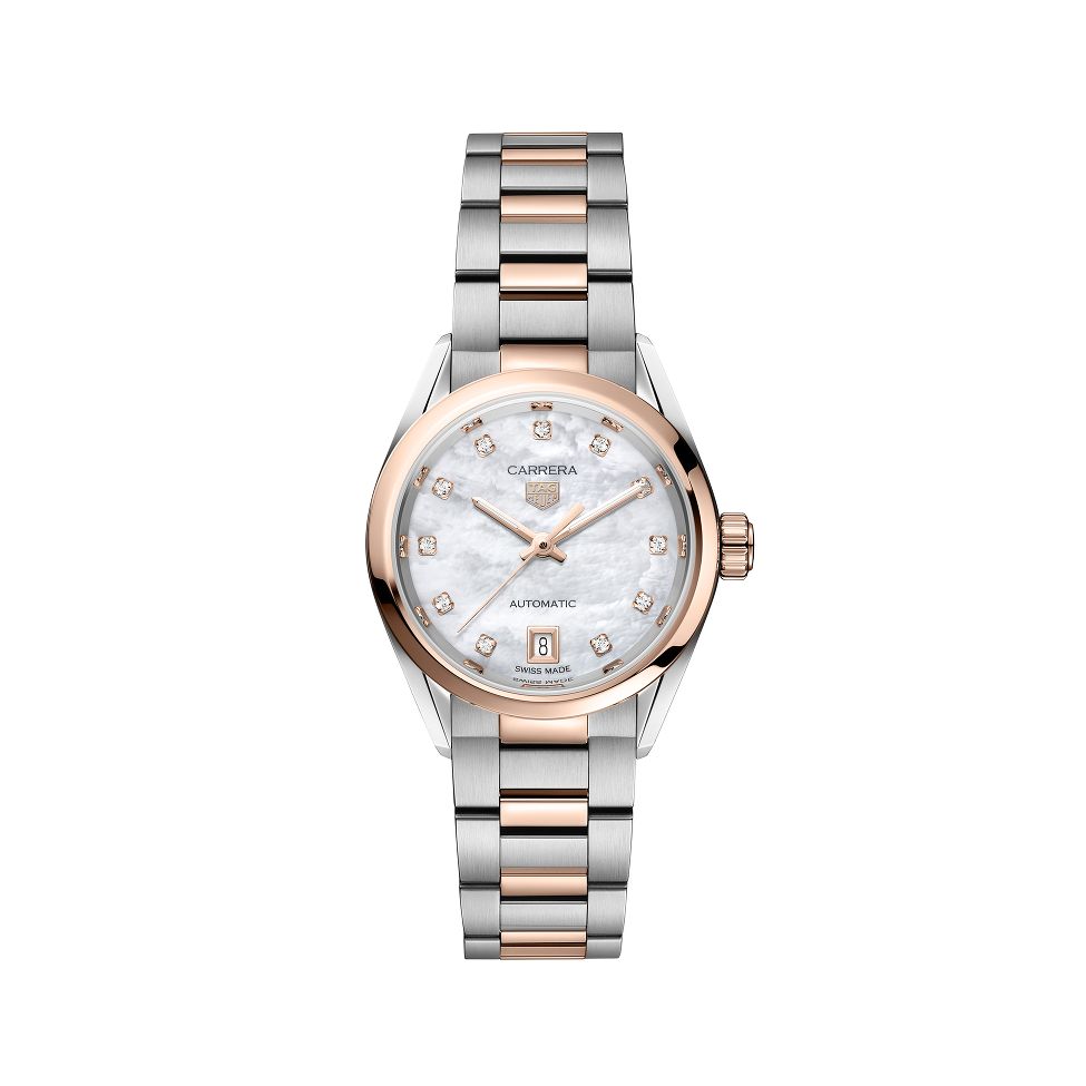 TAG Heuer Carrera 以精钢与18K 玫瑰金双色呈现优雅格调。表壳与表链采用抛光与拉丝交替处理,佩戴舒适并富层次。内部搭载 Calibre 9 自动机芯。