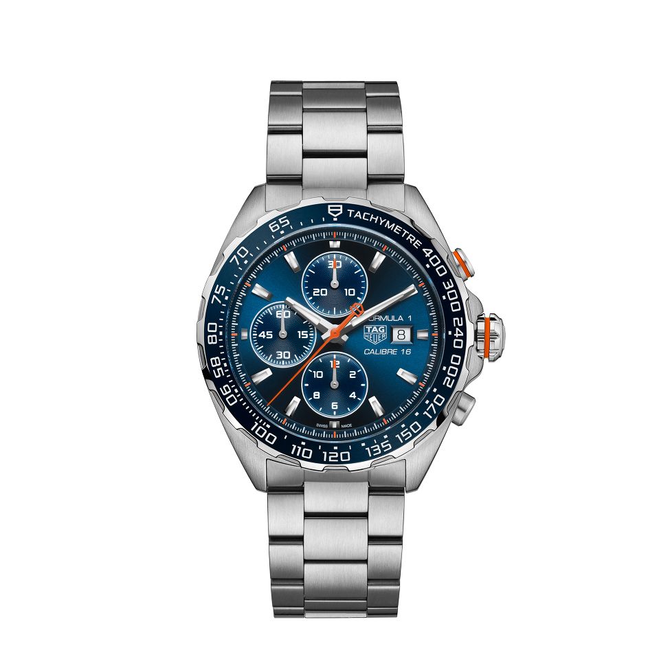 TAG Heuer Formula 1 采用精钢表壳与钢链,坚固耐用。内置 Calibre 16 自动机芯,驱动计时功能;表圈测速刻度便于换算速度。立体按键与顺手表冠配合夜光指针与时标,读取清晰。整体风格运动而实用,适合日常佩戴。