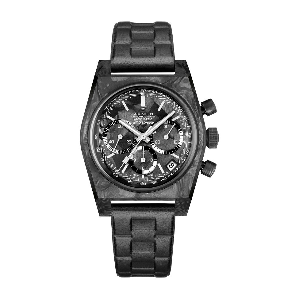 真力时 Chronomaster 以碳纤维表壳配织物表带,轻盈坚固,运动气质鲜明。内部搭载 El Primero 400 自动机芯。计时功能精准可靠,表圈与刻度设测速与脉搏计,可快速读取速度与心率。指针与立体时标清晰易读。全球限量 150 枚。